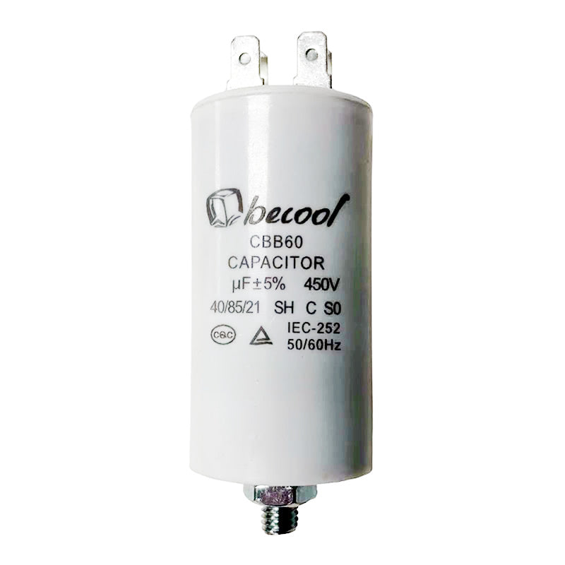 Reliable and compact, this 450V AC capacitor is designed for consistent performance in demanding electrical applications. Housed in a durable plastic case and equipped with an M8 mounting stud, it offers secure installation and long-lasting operation. Ideal for use in motors, HVAC systems, and general AC circuit applications.